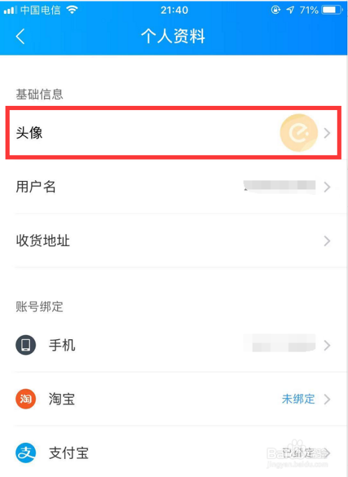 点击>图标后,进入小我资料页面。点击小我资料页面的第一行【头像】,如图所示。