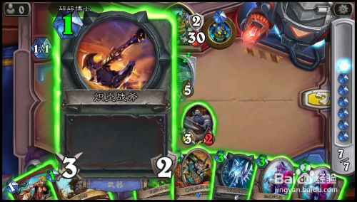 首先,为已方英雄装备上炽炎战斧兵器,使到手中的可骇海盗(你的兵器每有1点进犯力,该牌的神通耗损减1)卡牌的神通耗损变为0。
