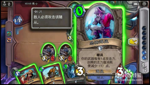 接着先后将手中的超等士兵(每当你呼唤一个进犯力小于或等于3的侍从,使其获得冲锋结果)、暴动兵士(每当一个侍从受到危险,该侍从将增添1点进犯力)、2个可骇海盗等卡牌,打出放入场中。