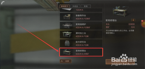 我们来抵家具建造页面之后,我们标的目的下滑动找到“家用补缀台 ”,点击它再点击“建造 ”按钮,在建造之前我们要事先带好需要的600木头和4铁矿,这个两种材料放在背包里带曩昔 。