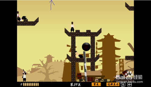 朝右上偏向射击,枪弹反射将中心墙体上面的两名匪贼击毙,接着,反射到右下方,将右下方的火药引爆,将右边的匪贼炸死。