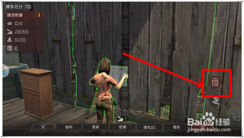 然后在建造状况下,走到你要拆除的墙前,这时这面墙默认会被白边标识,然后点击底部东西栏中的“删除”按钮。