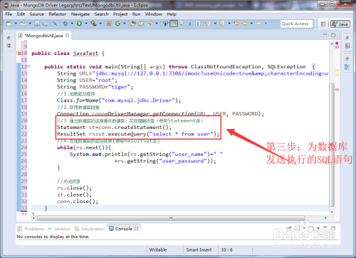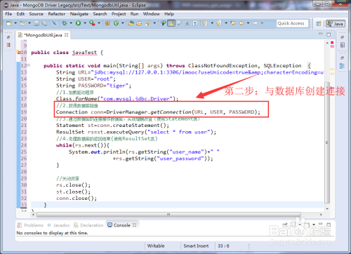 JDBC数据库毗连方式内容三:在数据库东西类内编写相关代码运行即可完当作毗连。代码如下图所示。