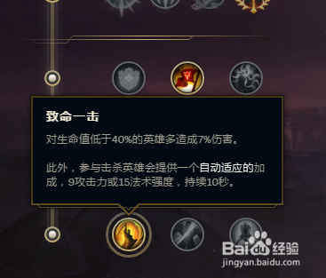 最后点出增添剑圣收割能力的致命一击。这个符文提高剑圣对血量低于4当作的仇敌的危险。