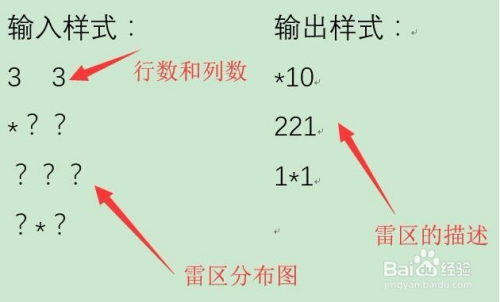 输入数据时,第一行为地雷分布图的行数和列数,划定雷区的行列数小于100。接下来是雷区分布图各格的地雷分布,“*”暗示是地雷,“?”暗示格子中无地地雷,每个字符之间无任何分隔符。
