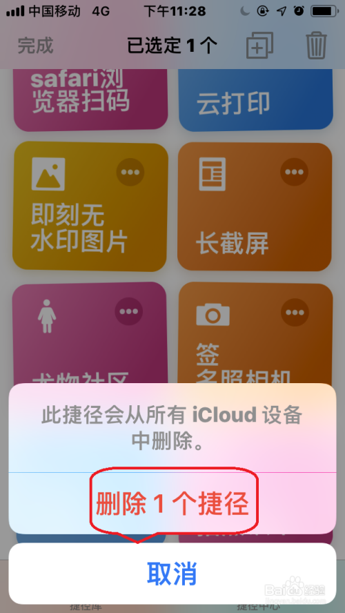 弹出提醒框,点击“删除1个捷径”,确认捷径删除。