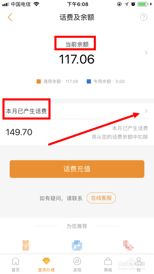 进入 话费及余额 页面后,就可以看到我们此时的手机话费余额以及本月已经发生的话费。我们先来看看余额详情,点击下图红色箭头所指的位置。