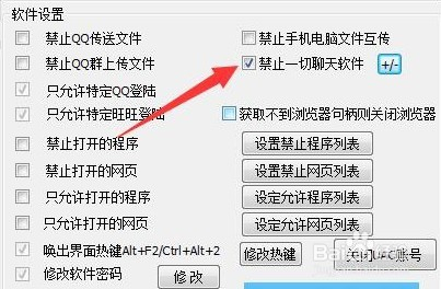 安装运行后,这时处于主动运行后台埋没状况,我们可以按ALT+F2打开法式本家儿界面,在设置界面里面,勾选“禁止一切聊天软件”,如许就可以解除对Q运行的限制了。