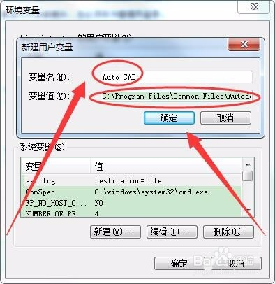 新建用户变量窗口中,变量名取名为Auto CAD,变量值为C:\Program Files\Common Files\Autodesk Shared,单击确定。