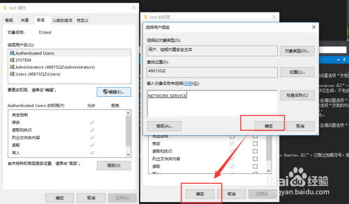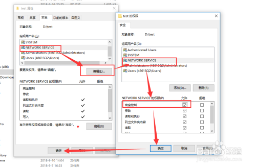 7. 互道平安选项卡中,点击如图所示的编纂按钮,找到【Network service】勾选如图所示的【完全节制】->【确定】