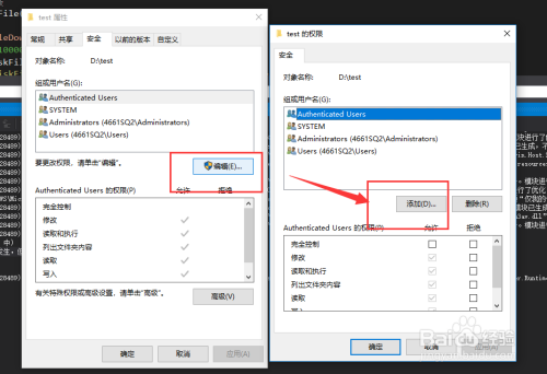 3. 在平安选项卡下,点击如图所示的编纂按钮,在弹出的【权限】窗口中点击如图所示的【添加】