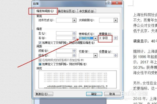 呈现“段落”对话框。点击“缩进和间距”选项卡,在“特别格局”中,选择“首行缩进”,在“怀抱值”中设置为“2字符”,点击“确定”。