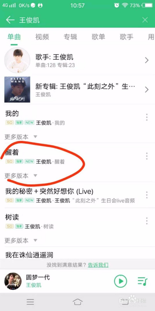 例如我要找王俊凯的醒着,可以直接输入醒着,也可以输入王俊凯,从王俊凯的歌曲列表来找这首歌