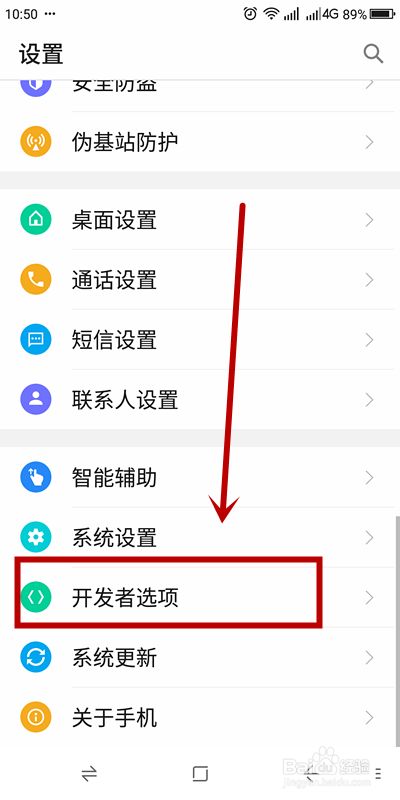 在设置页面标的目的上滑动,在页面底部找到“开辟者选项”单击