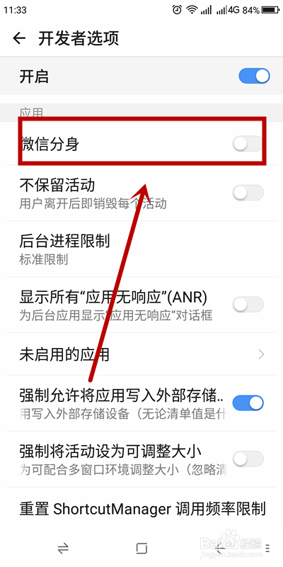 在开辟者选项页面,同样标的目的上滑动页面,在页面下部,找到“应用”下的“微信兼顾”单击,打开兼顾开关。