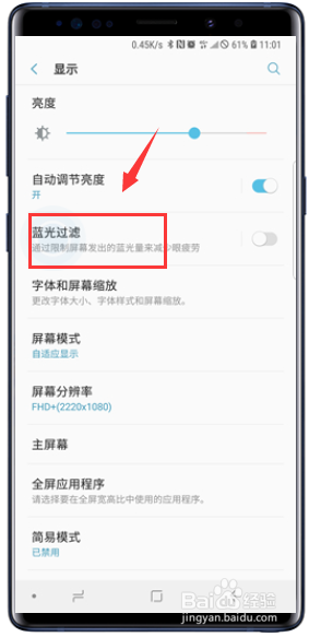 在显示界面点击蓝光过滤选项卡进入,如下图所示