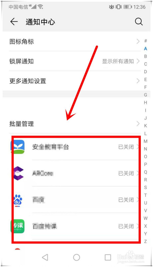 华为手机呼吸灯设置第六步:返回到“通知中间”页面,在批量办理下方,找到你要设置的某个应用,点击打开。