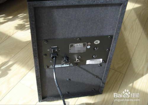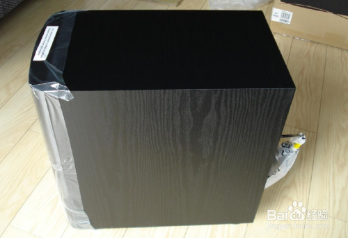 低音炮的箱体是木质的,是黑色的木纹外皮。前面板是亮光的塑料材质,出厂时包着庇护膜。箱体后面的电源线也用塑料袋装着。