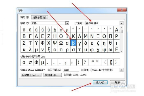 在“子集”中选择“根基希腊语”,并鄙人方选中要插入的希腊字母,点击“插入”。