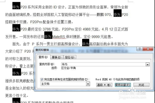 则文档中所有的“华为”都被选中。