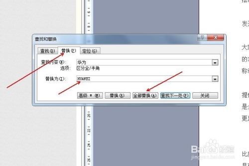 点击“替代”选项卡,在“替代为”输入框中输入“HUAWEI”,点击”全数替代“。