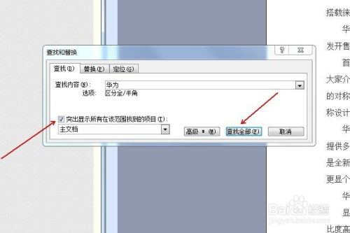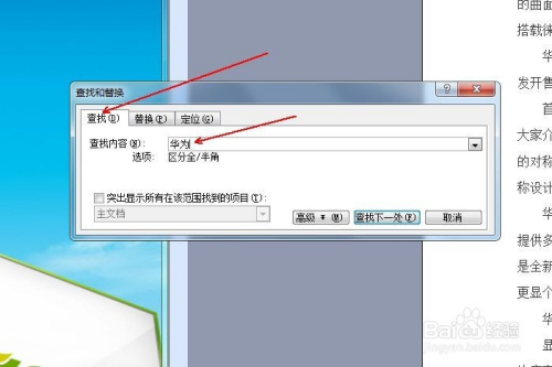 呈现“查找和替代”对话框。选择“查找”选项卡,在“查找内容”输入框中输入“华为”。