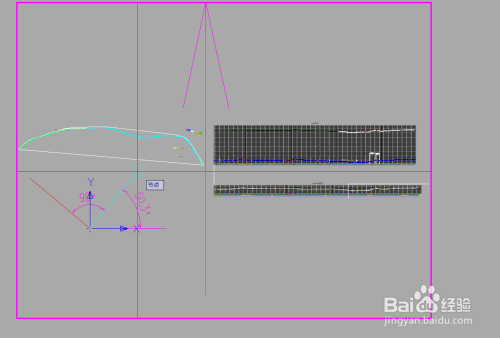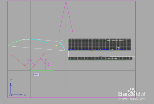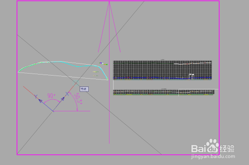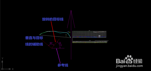 回到模子(黑色底色)里面,选择需要扭转的方针线(此方针线将会在结构窗口里面平行于结构窗口底缘线,即大师认为的X轴),做与方针线垂直的垂线即辅助线。为便利不雅察对比,下图红色方针线随意画出(洋红色参考线垂直与箭头,此处仅作示意)。