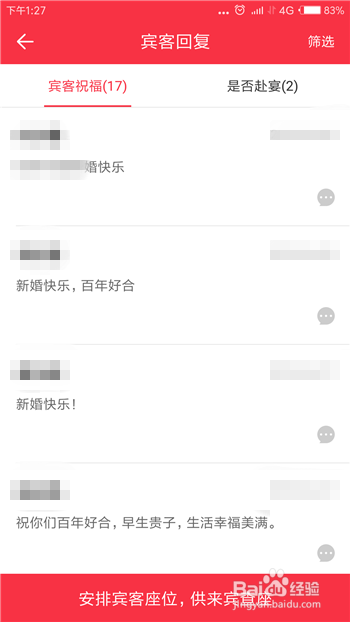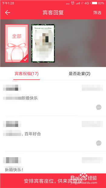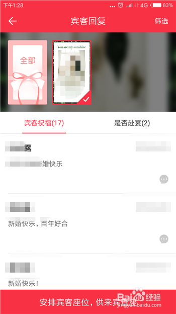 接下来就会打开宾客答复界面了,这里有宾客祝福和是否赴宴两个答复。