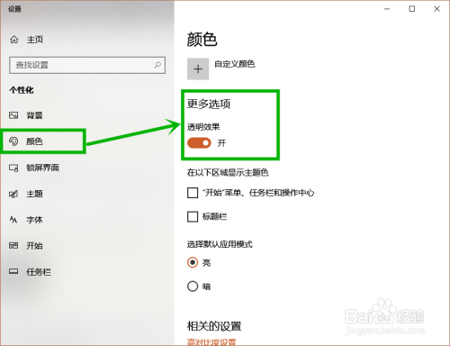 2.在打开的设置界面左侧选择【颜色】选项,然后在右侧的【更多选项】下面封闭【透明结果】就行了