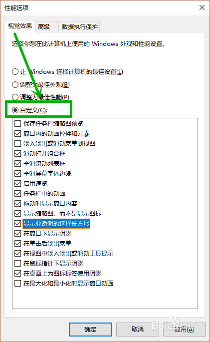 3.在打开的【机能选项】窗口的【视觉选项】选项卡,选择【自界说】然后按照小我需要选中需要的选项点击【应用】后【确定】就行了