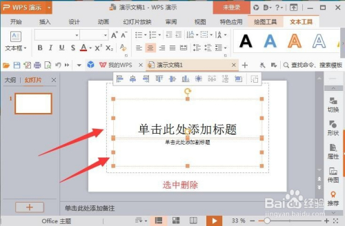 第二步:新建演示文稿中的题目和副题目文本框选中删除。