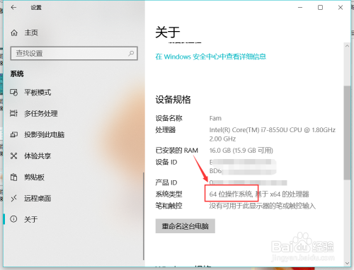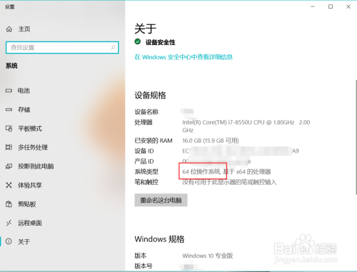 然后就能在“关于”选项中找到这台电脑的“设备规格”,此中就有几多位系统的显示。