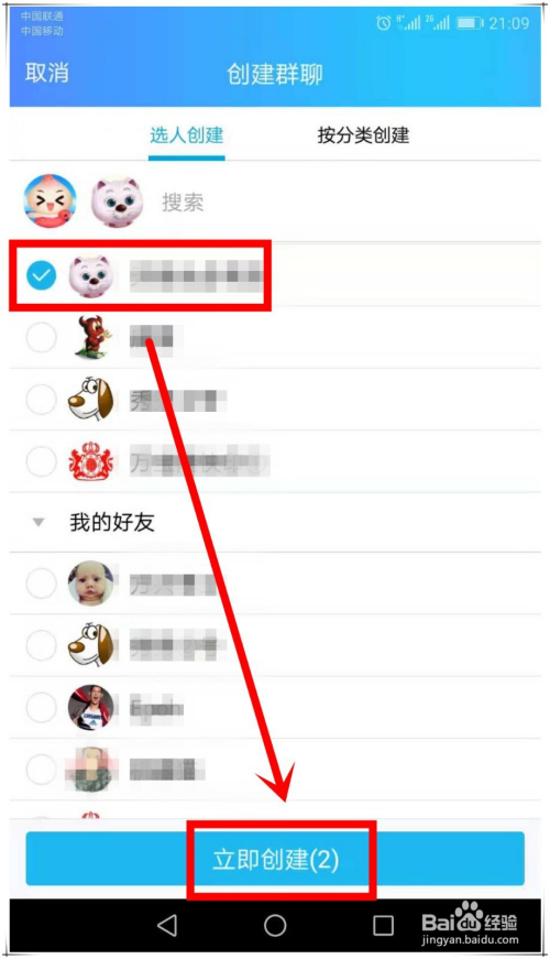 从QQ老友中选择人建立群聊,与从其它QQ群中选择人建立群聊的操作差不多,只是这里是从QQ老友中选人,准确选择后,点击建立,即可当作功建立QQ群。