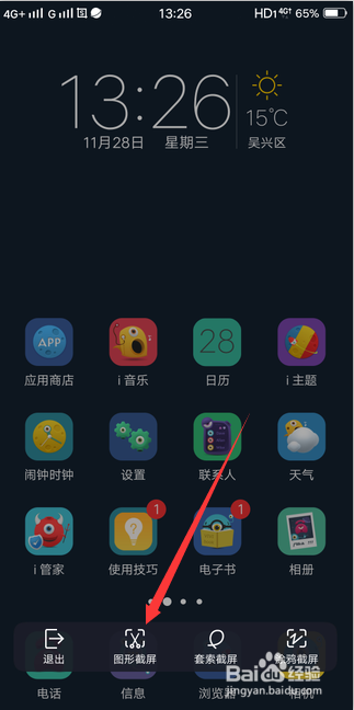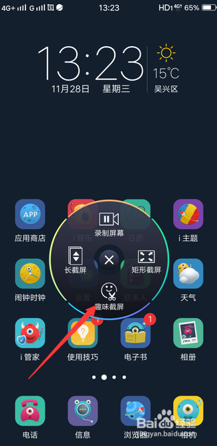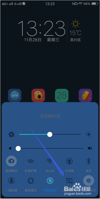 底部弹出节制中间,找到并选择位于此中的超等截屏按钮图标,如下图所示。