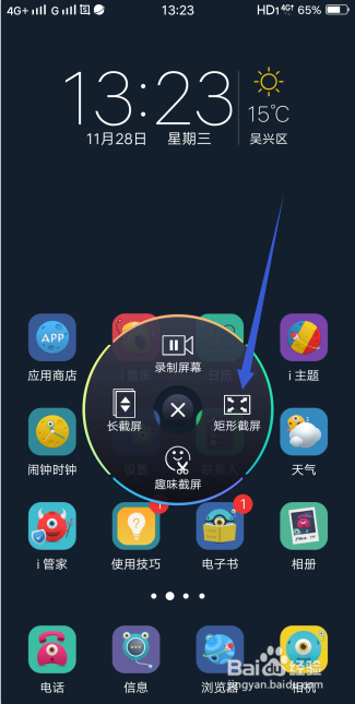 此时,屏幕中心会有超等截屏的功能图标,除了最上方是录屛外,别的三个都是截屏,先来看到矩形截屏。