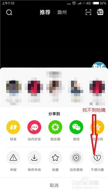可是在打开转发界面后发现里面找不到抢镜功能,如图,一般抢镜功能是在第二排,到这里找不到。