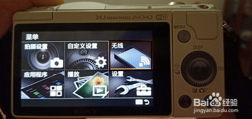 然后我们在相机上按右上角的MENU键,可以看到屏幕上右上角有一个无线选项,点进去。