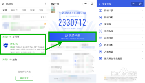 在本家儿页点击顶部的【搜刮】按钮输入“腾讯110”后点击搜刮到的小法式,进入小法式页面后点击【我要举报】,完当作对违规人的举报