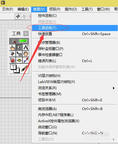 首先,点击菜单-->查看-->东西选板,把东西选板挪用出来。