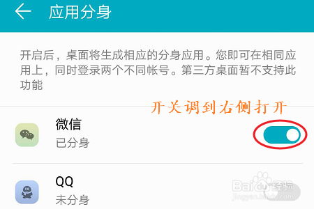 点击进入之后我们会看到系统今朝撑持微信和QQ两个应用,开启方式也很简单,只需将应用右侧的按钮调到右侧打开即可;