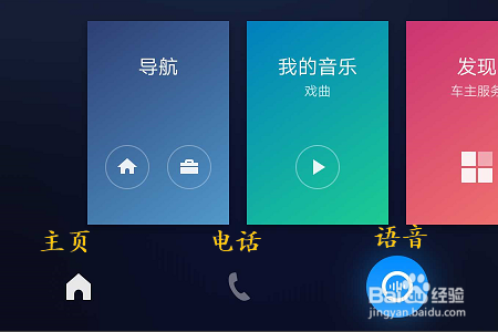 应用最下端共有5个按键,都是日常平凡司机们最常用到的功能,别离是本家儿页、德律风、语音、地图以及音乐,如图一...