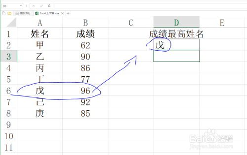 为了便于申明和理解,教程以下列数据为例,需要获得成就第一论理学生的姓名,并将成果放入D2单位格中。