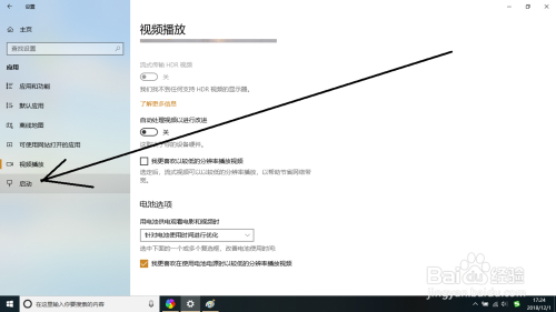 打开视频播放对话框中的左栏选项中点击启动选项。