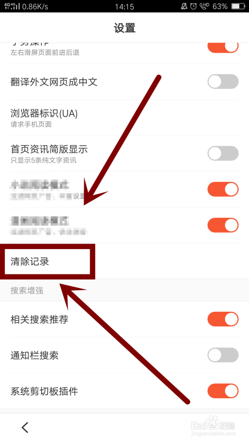 在浏览器设置界面,点击打开断根记实设置,如图所示