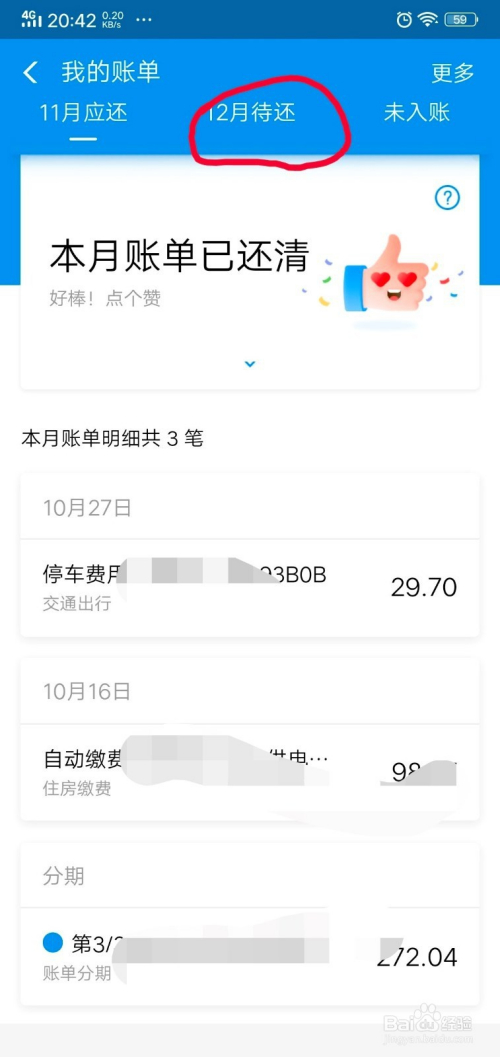 这时进入我的账单界面,若是本月已经还清,界面会显示。我们点击上方“12月待还”选项,如下图所示。