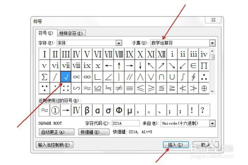 在“子集”中选择“数学运算符”,并鄙人方选中对钩,点击“插入”。