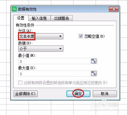 第五步:我们可以按照本身的需要设置有用性前提,可所以整数、时候或者文本长度等等,我们这里设置的是文本长度不跨越1,也就是只能输入一个字。