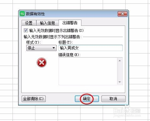 第六步:我们可以按照需要设置犯错警告,在题目框中输入警告的内容,设置完当作后,单击“确定”按钮。