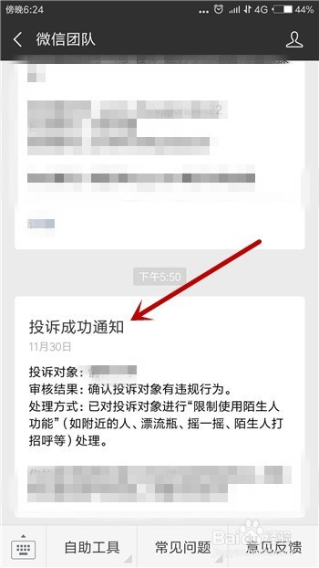 投诉后官方处置会发送信息给我们,如图,小编在投诉这小我之后官方禁用了他加老友的相关功能。