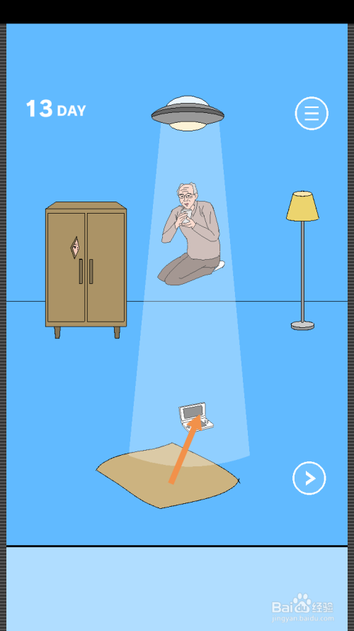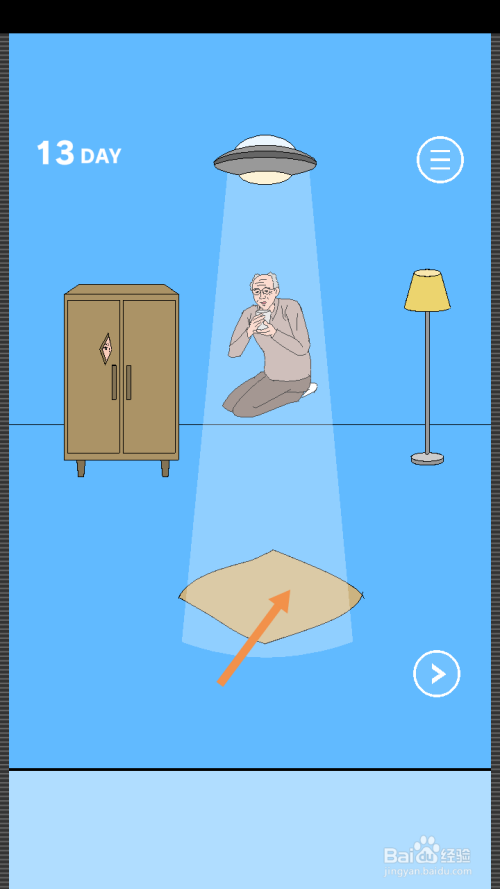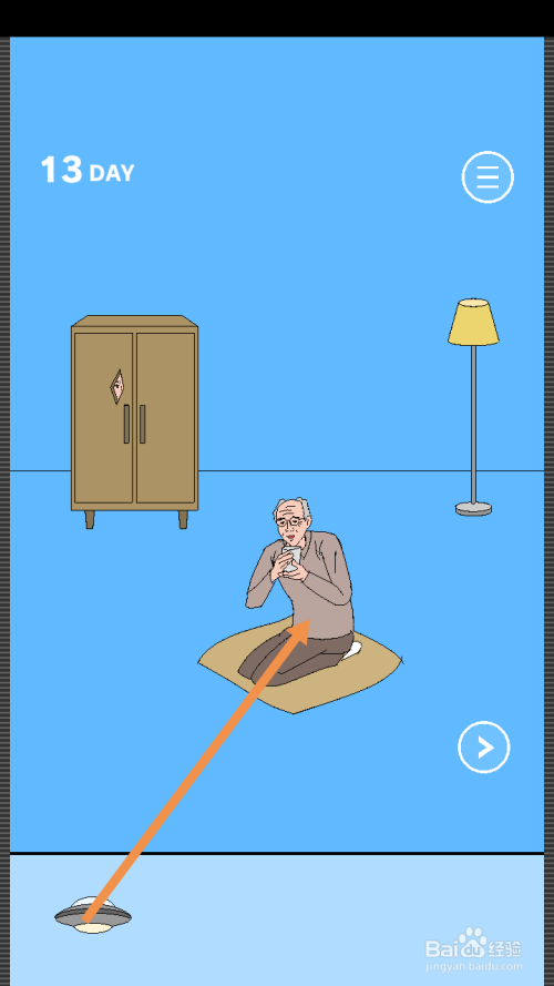 获得飞碟后,点击标的目的左箭头,进入左边的房间。在左边房间里,将飞碟拖动到爷爷身上。